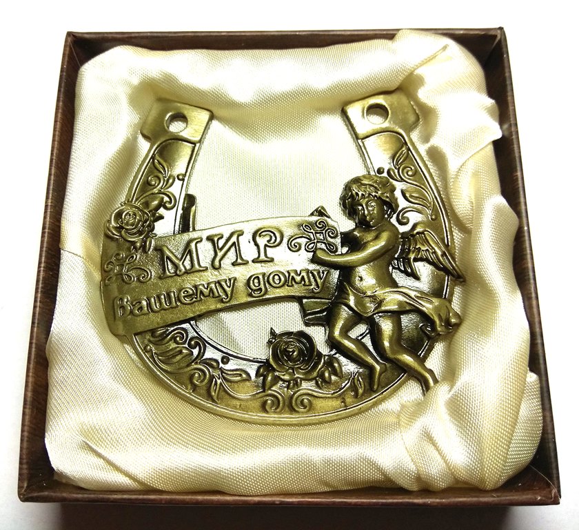 Подкова из металла с надписью Мир вашему дому непременно принесет благополучие и добро обладателю.
