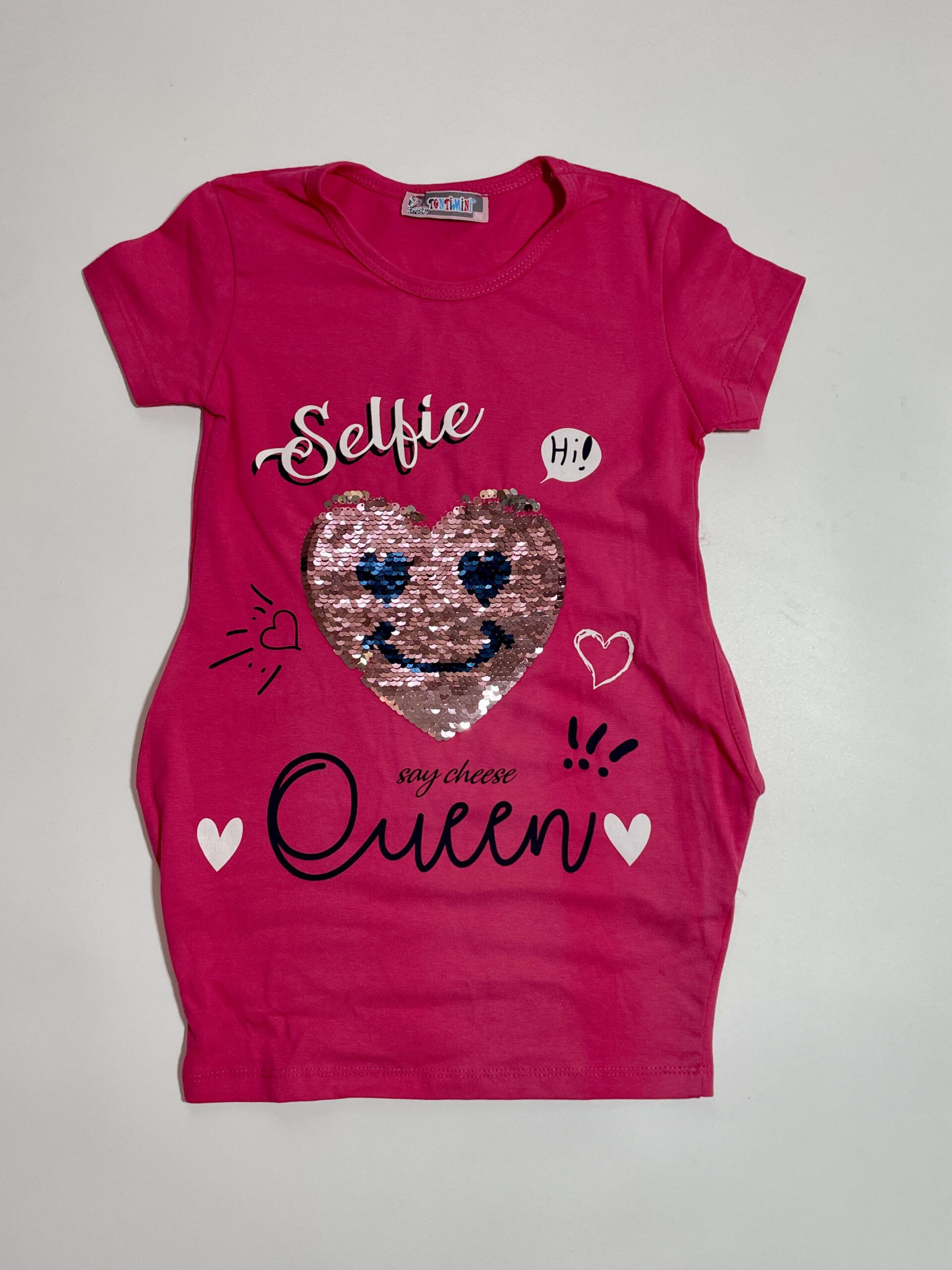 Туничка-платье “Смайлик” на возраст 4, 5, 6, 7, 8 лет. Туника украшена двусторонними пайетами в виде сердца со смайликом, так же есть карманы по бокам.