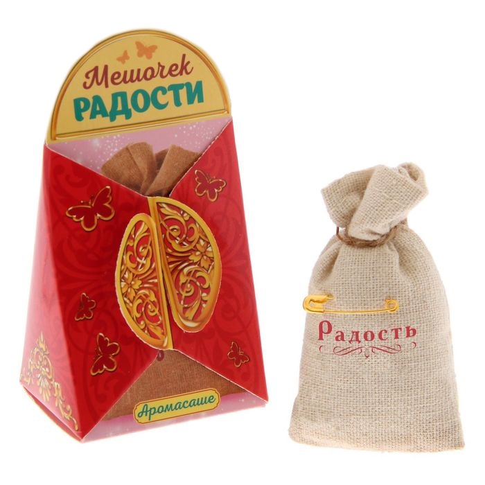 Мішечок з ароматизованими травами упаковано в дизайнерську упаковку з побажаннями. На мішечку є шпилька, за допомогою якої можна закріпити талісман на одязі, в сумці або іншому місці. Порадуйте себе або своїх близьких купивши в подарунок аромасаші на радість.