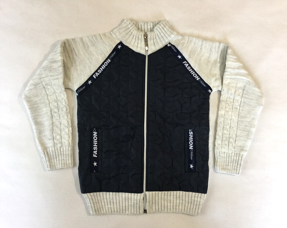 В’язана кофта бомбер на вік 6, 8, 10 років (повномірна). Зручна блискавка, внутрішні кишені; в’язана гумка на поясі, комірі та манжеті. Спинка однотонна в’язка, перед оформлений плащівкою чорного кольору, рукави красива в’язка. Весь виріб сірувато-білого кольору.